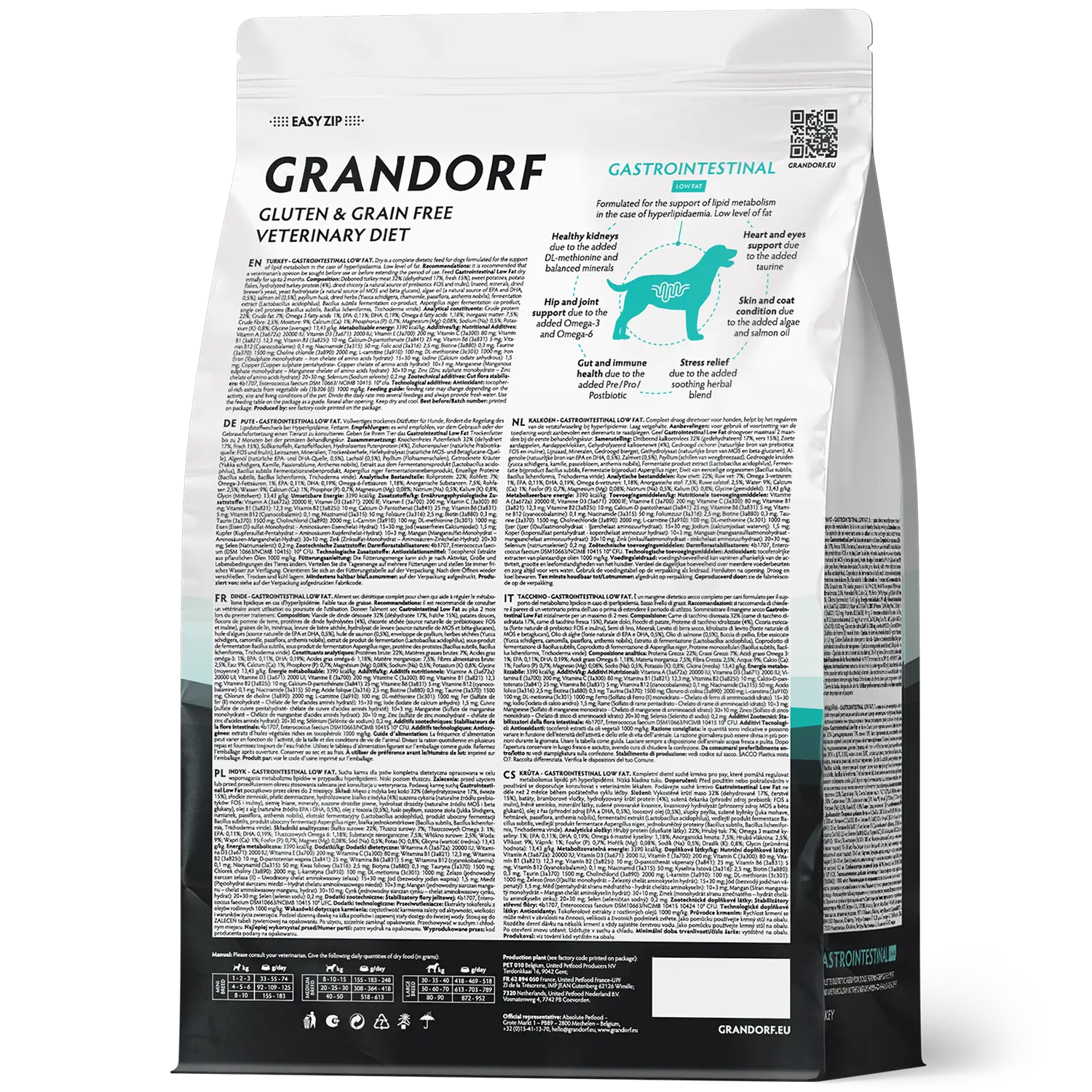 Viande de dinde désossée 32% (déshydratée 17%, fraîche 15%), Patate douce, Flocons de pomme de terre, Protéines de dinde hydrolysées (4%), Poudre de racines de chicorée (source naturelle de prébiotiques: FOS et inuline), Graines de lin, Minéraux, Levure de bière (source naturelle de MOS et bêta-glucanes), Hydrolysat de levure (un source de MOS et bêta-glucanes), Huile d'algues (source naturelle d'acides eicosapentoénoïque et docosahexaénoïque) (0,5%), Huile de saumon (0,5%), Enveloppe de psyllium, Herbes séchées (Yucca schidigera, camomille, passiflora, anthemis nobilis), Extrait de produit de fermentation (Lactobacillus acidophilus), Sous-produit de fermentation Bacillus subtilis, Sous-produit de fermentation Aspergillus niger, Protéine des protistes (Bacillus subtilis, Bacillus licheniformis, Trichoderma viride).