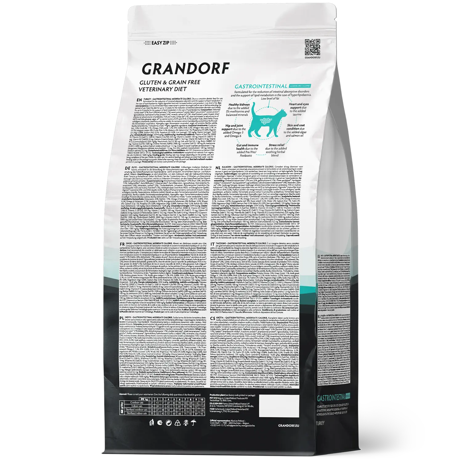 Deboned turkey meat* 37% (fresh 20%,dehydrated 17%), Sweet Potato*, Potato flakes*, Pea protein*, Potato protein*, Lignocellulose, Hydrolysed turkey protein* (4%), Minerals, Salmon oil* (2%), Brewer’s yeast (a natural source of MOS and bèta glucans), Linseed, Chicory roots powder (natural source of prebiotics: FOS and inulin), Turkey fat* (1%), Yeast hydrolysate (a natural source of MOS and bèta glucans), Algae oil* (a natural source of EPA and DHA), Psyllium husk, Dried herbs (Yucca schidigera, chamomile, passiflora, anthemis nobilis), Fermentation extract (Lactobacillus acidophilus), Bacillus subtilis fermentation co-product, Aspergillus niger fermentation co-product, Single cell proteins (Bacillus subtilis, Bacillus licheniformis, Trichoderma viride). *Highly digestible ingredients.
